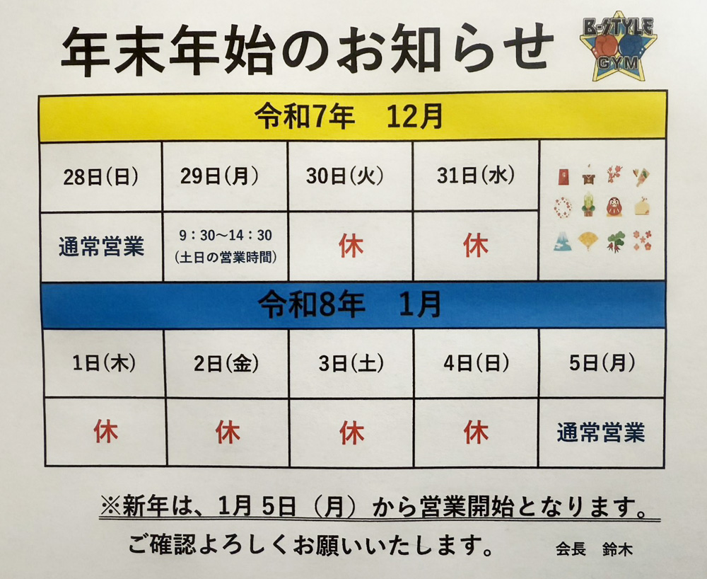 ・年末年始の休業期間は、12月30日〜1月4日となります。 - 【ストレッチ教室ついて】NEW