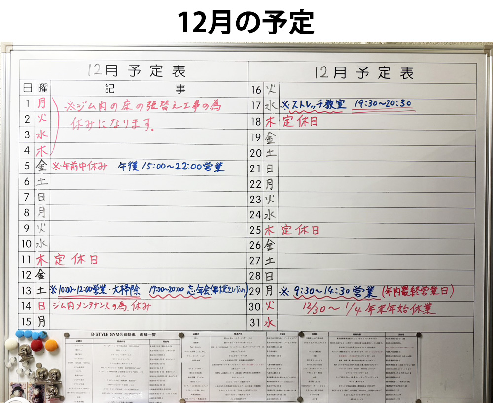 ・12月14日(日)は、大掃除後のジム内メンテナンス休業日となります。