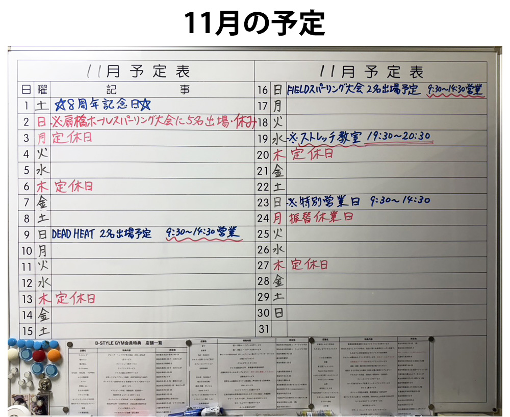 ・11月9日(日)は、DEAD HEATに2名が参加希望を出していて、試合が決まれば出場になります。試合が決まった場合、会長は不在になりますが、ジムの営業はします。